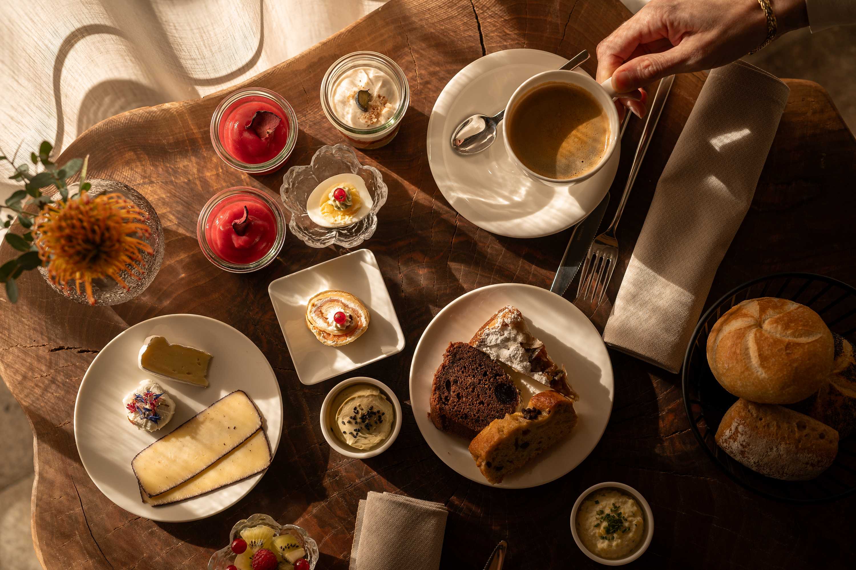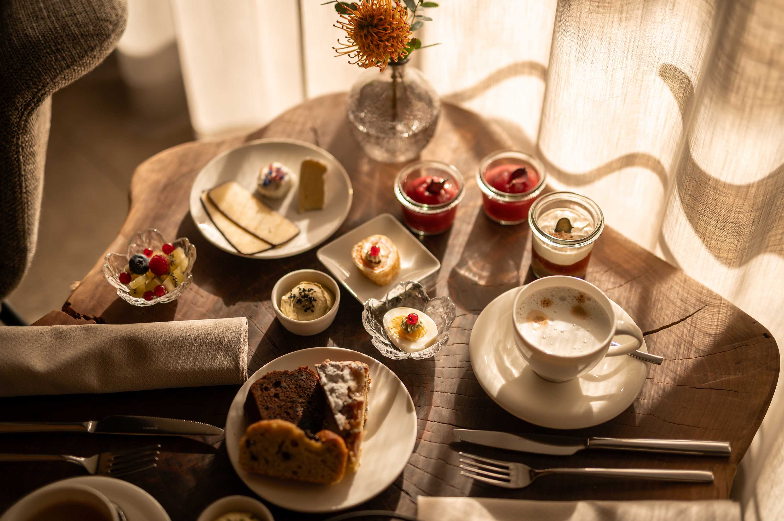 Knuspriges Brot aus dem Vinschgau. Hausgemachte Marmeladen. Frisches Obst aus den Obstgärten der Region. Feine Käse- und Wurstspezialitäten. Duftender Kaffee und cremiger Cappuccino.